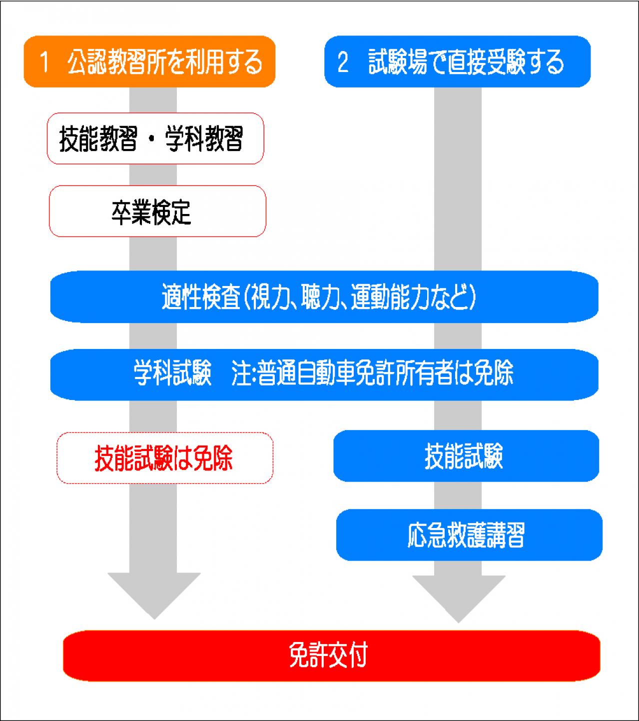 卒業後、運転免許試験場で適正検査と学科試験を受け(学科試験は普通自動車免許があれば免除)、合格すれば(詳細は下記参照)、指定自動車教習所の卒業者は「技能教習」と「応急救護講習」が免除されるため、免許が交付される。