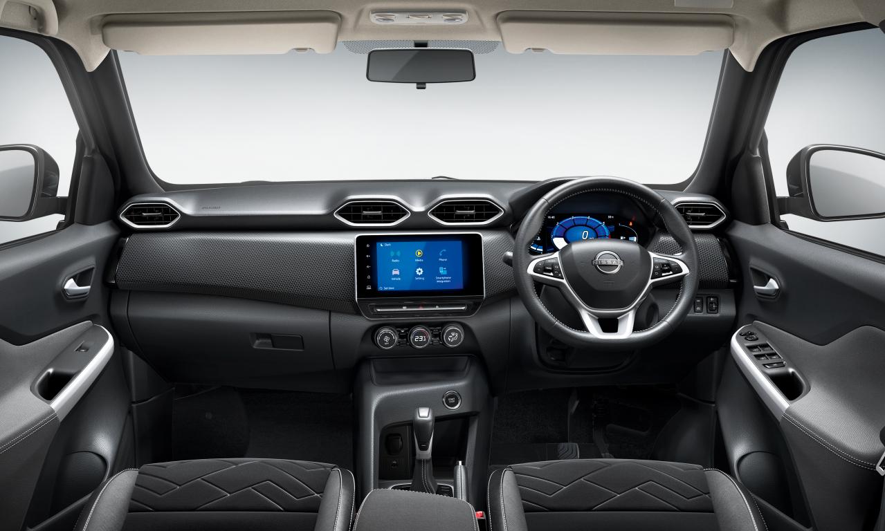「日産マグナイト」のエクステリアは、大胆で斬新なデザインになっており、自信に溢れた俊敏なスタンスを保ちながらも、元気で若々しい印象を与えている。シャープなLEDヘッドランプの下にはL字型のデイタイムランニングライトを採用し、日産の新しいブランドロゴが入ったグリルが、よりSUVらしさを際立たせるデザインになっている。