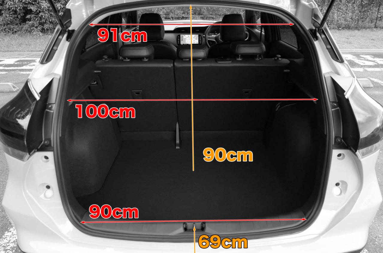 引き続き、リヤハッチの開口寸法。リヤハッチの形状自体は非常に起伏激しいのだが、開口形状は素直なオーバルという印象だ。トノカバーレベルの幅寸法が100cmというのは、何か示し合わせでもあるのかと思うくらいどの車も必ず確保している。物の出し入れという視点からすれば使いやすそうな形状である。