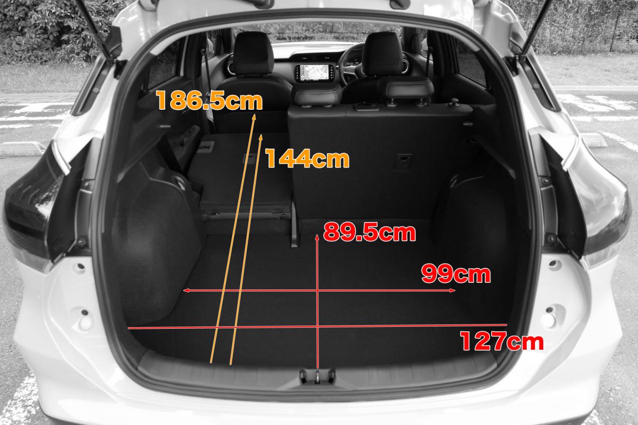 荷室内の寸法については、左右のホイールハウスの飛び出しが大きく見えることから一見小さそうに見えるものの、寸法としては平均レベルである。むしろ、ホイールハウスよりうしろの部位を大きく抉りこむことで127cmの寸法を確保しているのは、超尺物を載せるときなどに便利そう。また、助手席を倒したときの寸法も、小さなクルマにしてはとても長い。