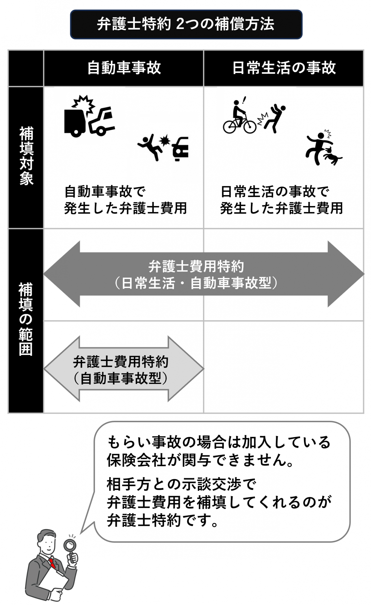 付随可能な特約 | ドラレコ特約 新車特約 搭乗者傷害特約(傷害一時金払) 搭乗者傷害特約(死亡・後遺障害) 身の回り品補償特約 日常生活賠償特約 車両全損復旧費用特約 自転車・車いす・ベビーカー等傷害定額特約 弁護士費用補償特約 ファミリーバイク特約 自転車・車いす・ベビーカー・シニアカー事故傷害定額払特約 |