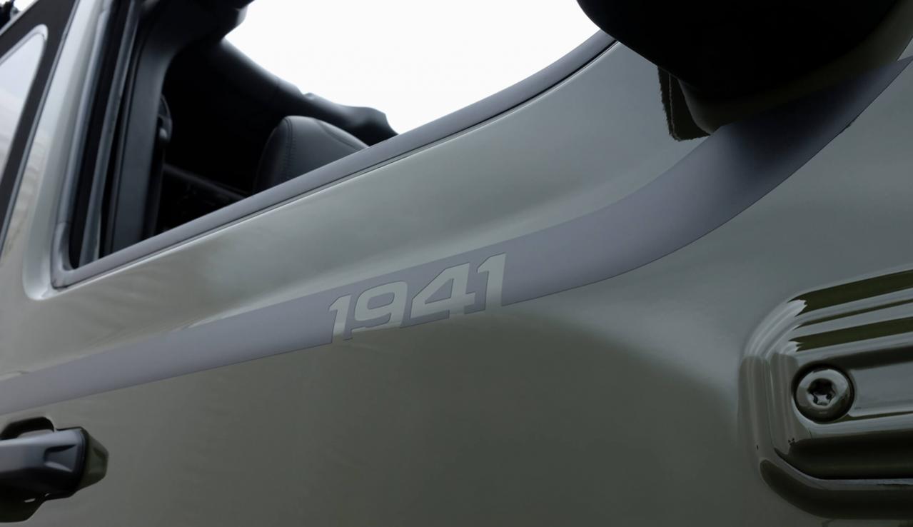 ボディカラーには、通常は設定されてない同限定車専用色のサージグリーンC/Cを採用。さらにジープの起源を示す “1941”ロゴ入りボディサイドストライプが特別にあしらわれ、ミリタリーテイスト溢れるルックスを際立たせている。インテリアカラーはブラックだ。