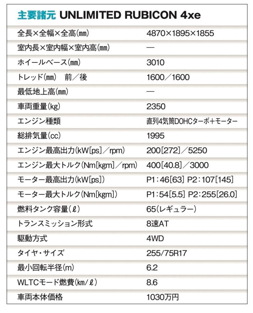 駆動用バッテリーの容量は15.46kWhで、EV走行可能距離WLTCはモードで最大42㎞と長くないが、兎にも角にもあのラングラーがEV走行できるところに意義がある。しかも、ラングラーの中でも特に優れた悪路走破性を誇る「ルビコン」を名乗ることにも注目だ。モーター駆動によるリニアな加速はオフロードでもコントロール性に優れ、扱いやすいことには違いない。
