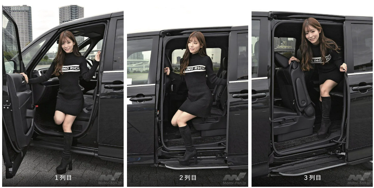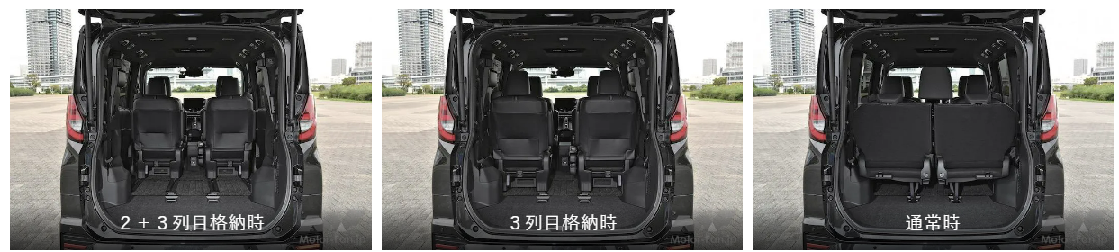 シートアレンジは充実している。3列目は、レバーを引くと自動的にもち上がり、サイドウインドウ側へ押し付けるとロックする。重いシートをもち上げたり、ベルトで固定する必要はない。また3列目を格納すると、2列目を後方へ大きくスライドできる。足元空間が広がり、リラックスできて、足元にバッグなどを置けて便利だ。リヤゲートは任意の角度で止められるから、狭い場所でも荷物を出し入れしやすい。左側には、電動スライドドアを開くと自動的に張り出すユニバーサルステップが3万3000円の低価格で用意され、乗降性をさらに向上させられる。