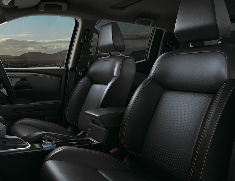 プロフェッショナルユースを意識し、乗員を保護するためのソフトパットも目を引くポイント。ステアリングは操作スイッチを配した3本スポークで、「GLS」はシルバー加飾を採用し、「GSR」ではダークチタン色の加飾に加え、オレンジステッチを用いている。シートは、「GLS」はファブリック。「GSR」ではシート座面の一部に本革、側面やヘッドレストなどに合成皮革を用いたレザーシートを奢り、ここにもオレンジのステッチを施した。実際には、タフな道具というより洗練の空間といった設えだ。