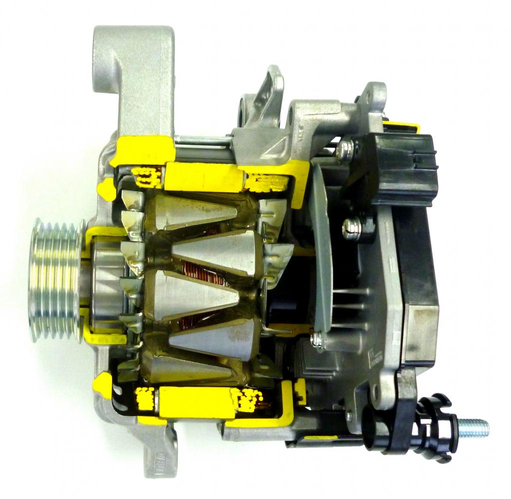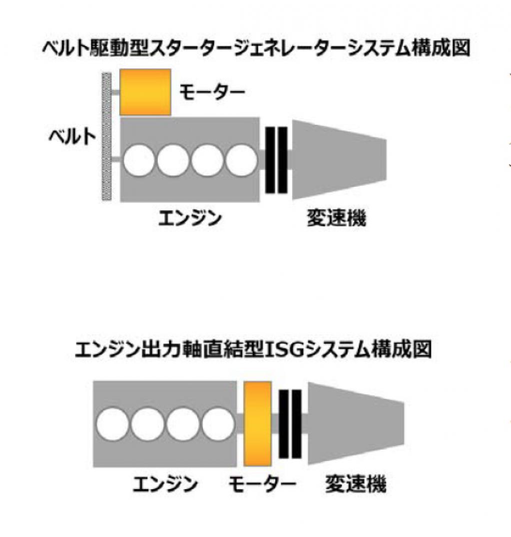 もうひとつ、エンジンの補機駆動ベルトで駆動させるISGがあり、これはISGまたはBSG(Belt-drive Starter Generator)と呼ばれ、通常のオルタネーターに似た外観である。ISGはマイルドハイブリッド向け、BSGはマイクロハイブリッド向けとも解釈できる。欧州で始まったシステム電源48V化は、通常の12V電源の4倍の電圧でISGを駆動し、燃費をセーブする試みであり、そのシステムの要がISGである。