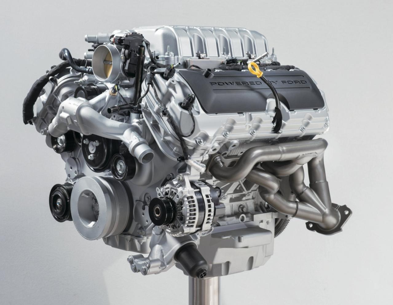 ツインカムヘッドによってGMのV8と差別化を図り、先進性をアピールするフォードの戦略はさらにエスカレートし、世界的に見ても異例なフラットプレーンクランクシャフトをCoyoteに与えるに至った。12.0の高圧縮比はCoyoteの新世代版で達成した技術を転用。高回転での燃焼特性を重視したのだろう、燃料供給はポート噴射のみとなる。2020年からはGMのスーパーチャージドV8に対抗して5.2 Voodooのシリンダーブロックをベースにしたスーパーチャージャー過給仕様のPredatorが投入された。高回転出力に狙いを絞ったVoodooと異なるのは、過給にともなう燃焼圧力増加に対応するために、クランクシャフトをコンベンショナルなクロスプレーンへと変更したこと。軽量のフラットプレーンクランクでは二次振動がカムスプロケットに及ぼす耐久性の懸念もあったと言われ、クランク形式の変更に加えてアルミ製のクランクマスダンパーを実装し、徹底的に圧力変動と振動への対処を施した結果、フォード市販車史上最高の557kWを発揮するに至った。