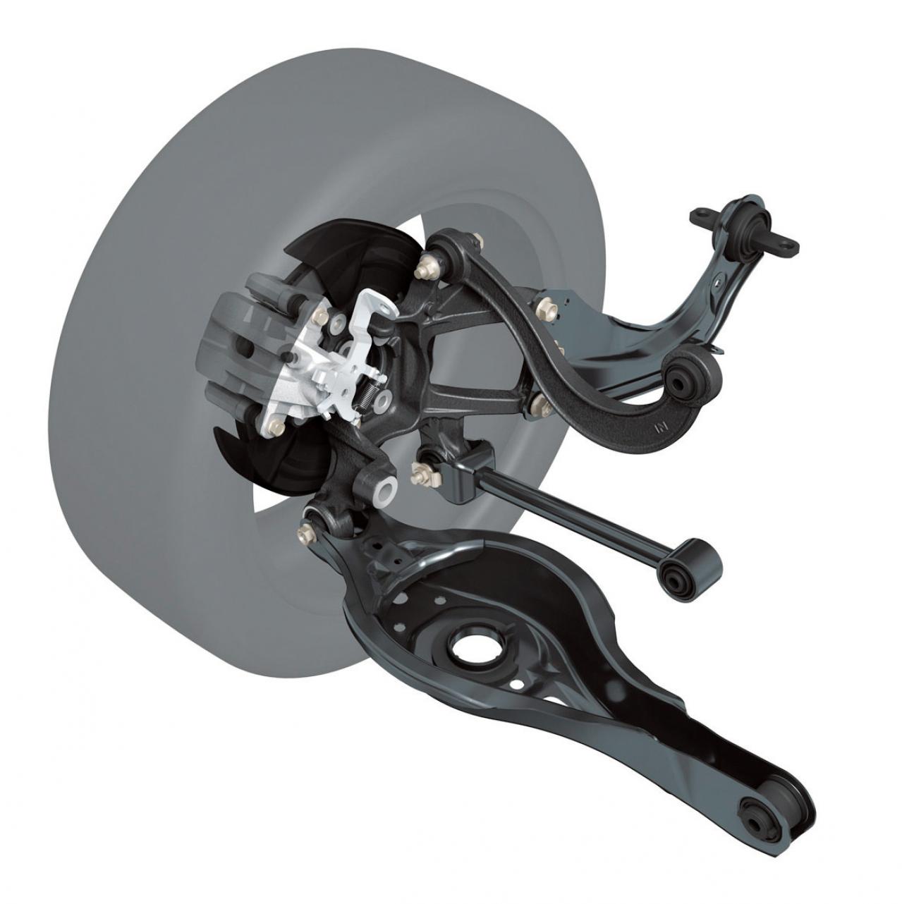 トレーリングアーム+3リンク式では前後力をトレーリングアームだけで受けるため、そのボディマウント部の車体局部剛性およびブッシュのセッティングが操縦安定性やNVを大きく左右します。