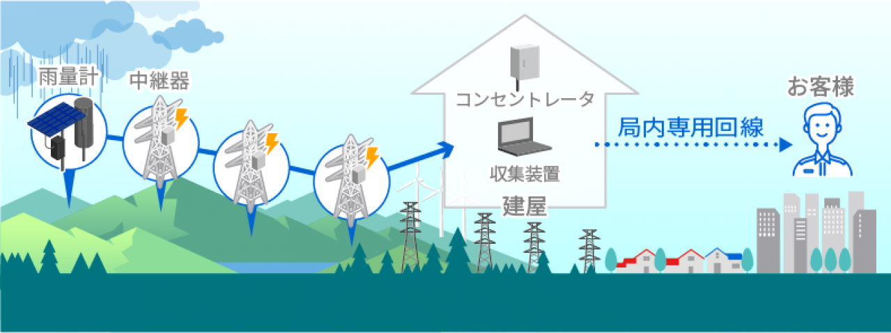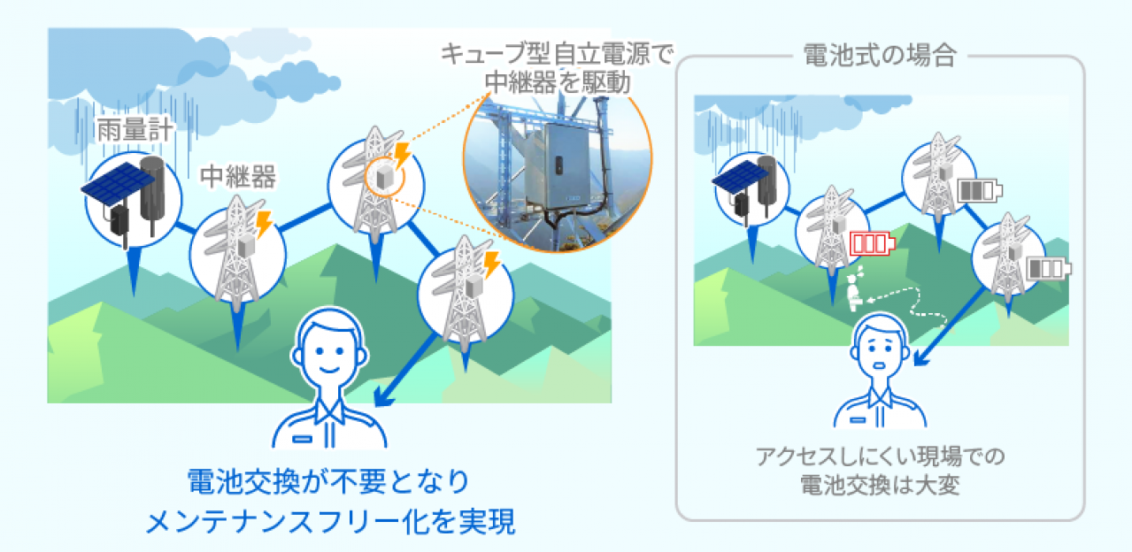 今回のシステム設置により、特定地域の山間部の雨量データを入手することが可能となる。水力発電所から尾根沿いに設置された送電鉄塔に計4台の中継器を設置し、総延長約2kmの無線ネットワークを作り、尾根の反対側の雨量データを920MHz無線で収集したあと、水力発電所建屋で局内専用回線に載せ替えて市街地の制御所に伝送する。本システムは、太陽電池パネルと東芝のSCiB技術を応用した蓄電池(リチウムイオン2次電池)を内蔵した小型のキューブ型自立電源を用いており、日照があるときに充電し、夜間や雨天時には蓄電池で稼働する。また、雨量計測局近隣の環境に配慮し、雨量計やセンサノードは環境色で塗装されている。これにより天候に左右されず、電池交換不要で環境にやさしいソリューションを提供することが可能。